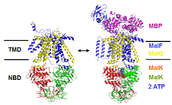 Many essential functions of living cells are performed by nanoscale motors consisting of protein complexes. The ability of these biomolecular motors to utilize chemical free energy to perform mechanical work makes them splendid molecular machines. Among various types of molecular motors, ATP-binding cassette (ABC) transporters represent a unique family of motor proteins that enable translocations of various substrates across cell membranes, by harnessing the free energy associated with ATP binding and hydrolysis (Davidson et al. 2008). Dysfunctions of ABC transporters have been linked to a number of diseases, including cystic fibrosis, the most common fatal hereditary disease in the US. Overexpression of certain ABC transporters also contributes to multidrug resistance of tumor cells after chemotherapy. Using multiscale computer simulations, our project aims to obtain a deeper understanding of conformational dynamics, enzyme catalysis, and the chemomechanical coupling mechanisms by which chemical free energy is converted into mechanical work in ABC transporters. Currently, we are focusing on elucidating ATP hydrolysis mechanisms in several ABC systems (Zhou, Ojeda-May, and Pu 2013).
