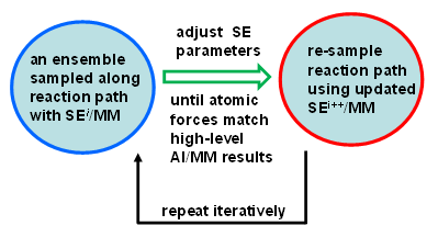 A long-standing challenge in computational enzymology is obtaining accurate free energy profiles for chemical reactions in condensed phases. Direct ab initio (AI) QM/MM sampling is computationally infeasible, so semiempirical (SE) methods are used instead — but they require careful reparameterization. We recently proposed Reaction Path Force Matching (RP-FM) (Zhou and Pu 2014), a new SRP-fitting strategy that reparametrizes SE methods directly against AI/MM forces in condensed-phase simulations. RP-FM proceeds iteratively: 1. Sample configurations along a reaction path on an SE/MM potential energy surface. 2. Adjust SE parameters to reproduce AI/MM atomic forces via force matching. Repeating this cycle enables SE/MM simulations to achieve AI/MM-level accuracy without direct AI sampling. We have demonstrated the effectiveness of RP-FM on proton transfer reactions in both gas and solution phases, and extensions to enzymatic reactions are underway.